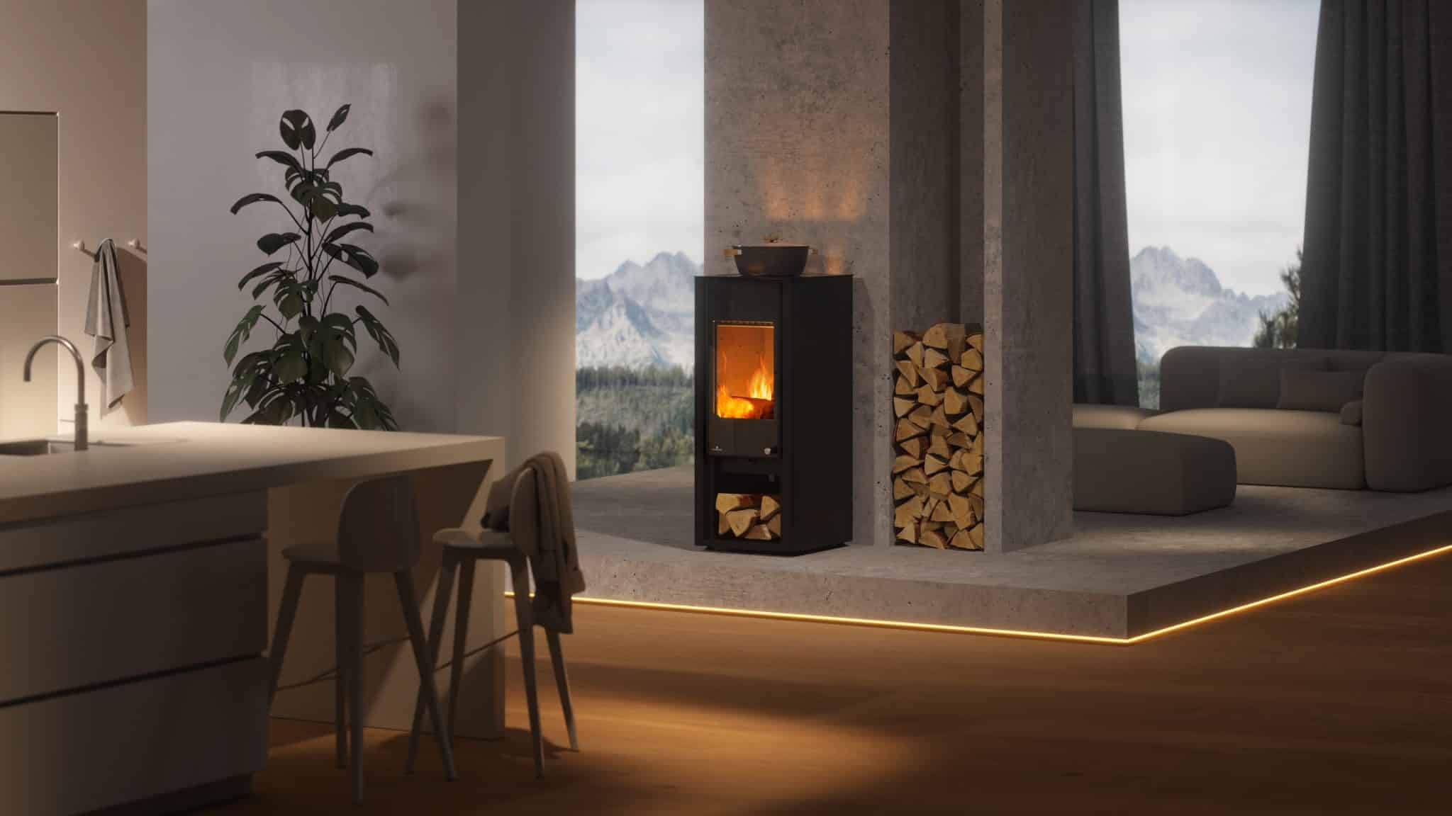 Genießen Sie die wohlige Wärme des knisternden Holzfeuers und beobachten Sie das Flammenspiel durch die große Panoramascheibe während Ihr Teekessel auf dem integriertem Cerankochfeld zum Kochen gebracht wird.