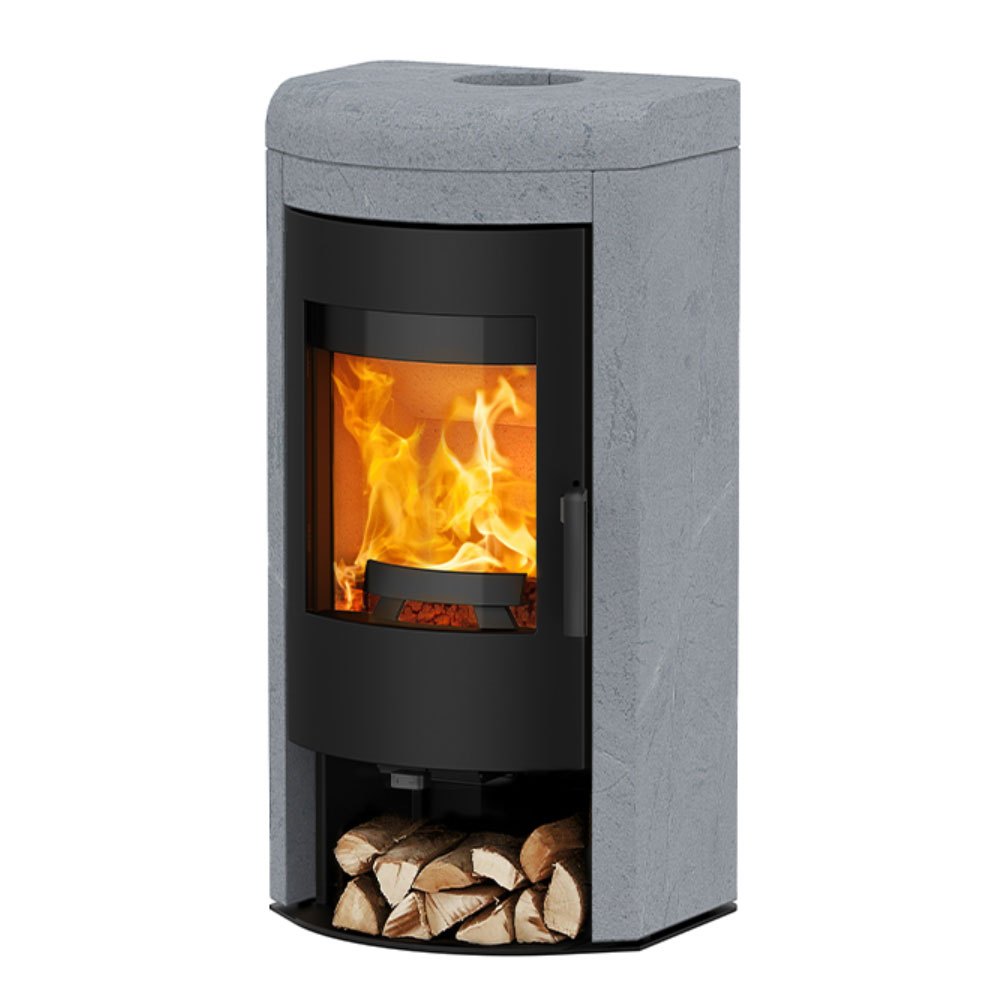 Der Kaminofen ist mit der Verkleidung Speckstein erhältlich und heizt mit Leichtigkeit große Räume. Die enorme Speichermasse der Verkleidungssteine ermöglicht Wärme für viele Stunden – selbst, wenn das Feuer längst erloschen ist.