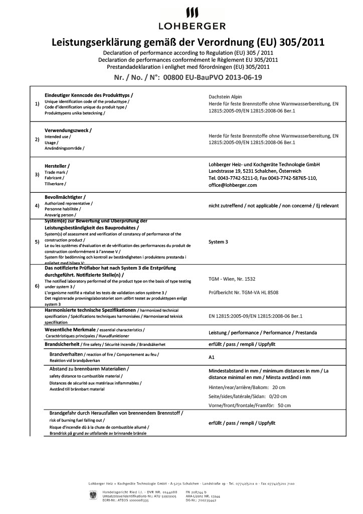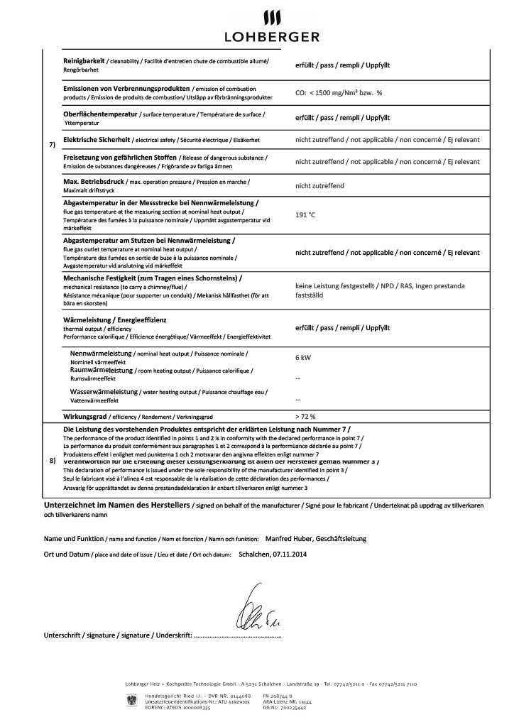 Alle neuen Grenzwerte, die in Deutschland durch die 1. BImSchV (Emissionsgrenzwerte 2. Stufe) sowie in Österreich durch Artikel 15a B-VG und durch die Schweizer Luftreinhalteverordnung LRV eingehalten werden müssen, werden vom Lohberger Produktsortiment erfüllt.
