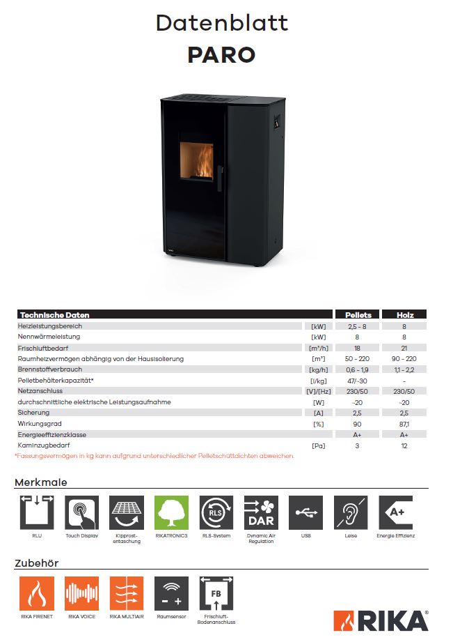 Der Kombiofen PARO vereint die Vorteile eines Kaminofens mit jenen eines Pelletofens und gibt dabei auch optisch eine sehr gute Figur ab. Kombiniert man nun noch eine besonders hohe Bedienfreundlichkeit mit einer automatischen Zündung, bleiben keine Wünsche offen. Der Ofen verfügt über eine Speichermasse von 65 kg und ist in einem Leistungsbereich von 2.5 bis 8.0 kW erhältlich. Der raumluftunabhängige Kombiofen verfügt zudem über einen Pelletbehälter mit einem Fassungsvermögen von bis zu 30 kg.