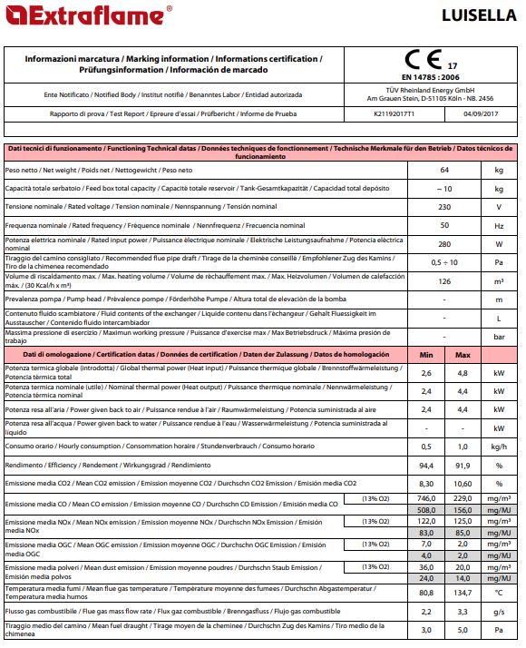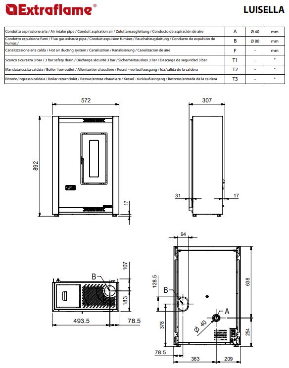 Merkmale:• Feuerraum, Feuertür und Brennschale aus Gusseisen • Rohrbündelwärmetauscher • Aschefach • Hermetischer Tank • Raumlüftung mit oberem Auslass mit eigenem Lüfter • Geringe Produkttiefe • Möglichkeiten für den Rauchauslass: nach hinten- unten, oben • Herausziehbarer Feuerraum (nur durch autorisierte Hilfe) • Serienausstattungen: 5-Tasten-Fernbedienung; Led display
