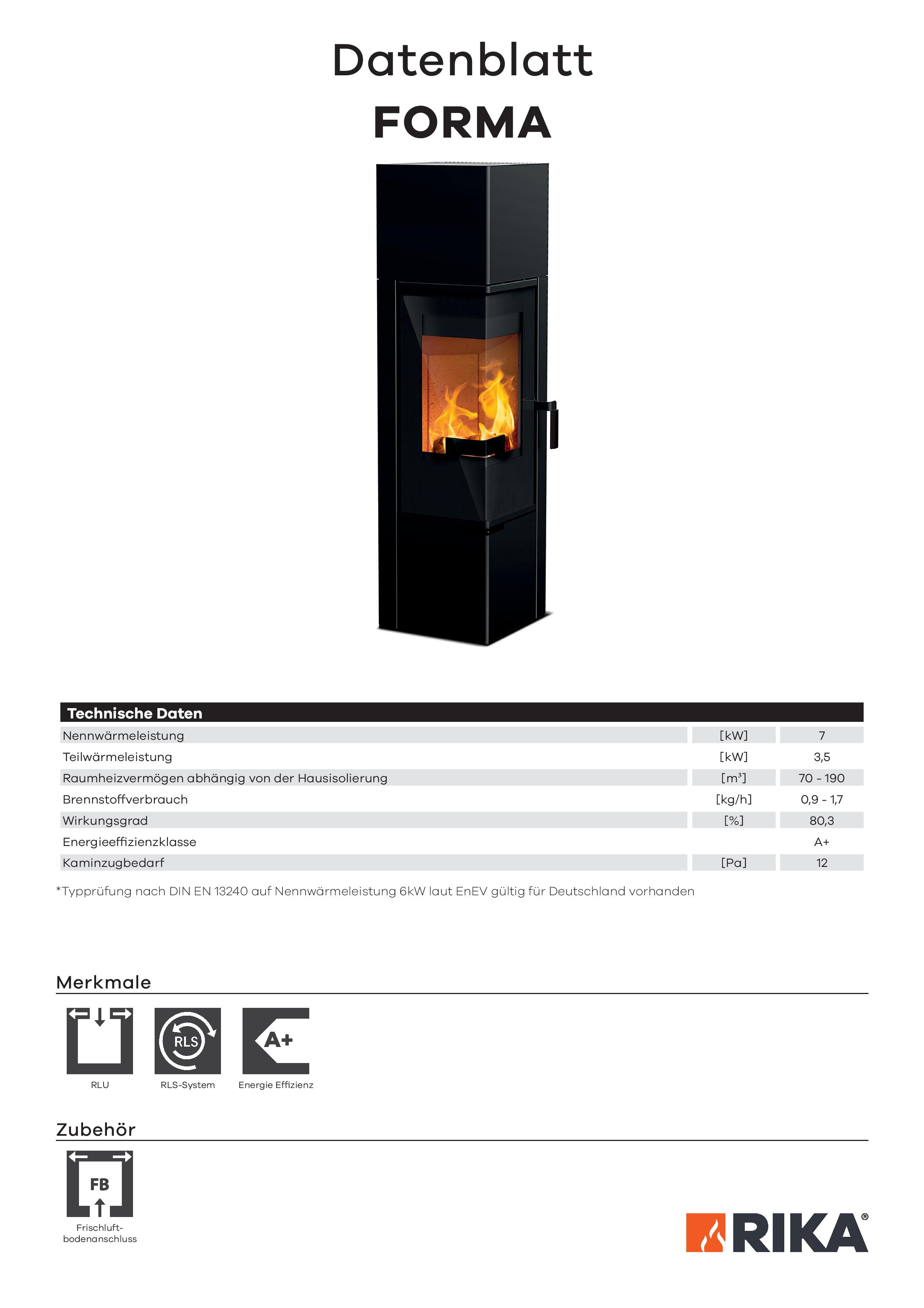 Beim Kaminofen FORMA handelt es sich um einen schmalen und platzsparenden Ofen mit der typischen RIKA Designsprache. Der Fokus des Ofens liegt gänzlich auf dem Feuer, das über das eckige Sichtfenster von zwei Seiten aus einsehbar ist. Seine Bauart macht den Kaminofen FORMA auch zur idealen Lösung für eine Eckplatzierung.