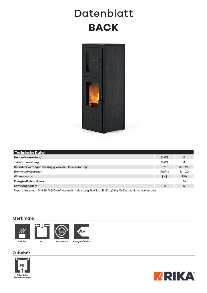 Der Ofen für Bäcker aus Leidenschaft! Der RIKA BACK Kaminofen verfügt über ein integriertes Backfach und ermöglicht Ihnen die zusätzliche Nutzung der Wärme für die Zubereitung leckerer Gerichte oder zum Backen. Durch das zusätzliche Sichtfeld haben Sie auch stets die Kontrolle über Ihre Kreationen. Der Stahlkorpus kann durch verschiedene Dekorseitenverkleidungen an Ihren Wohnraum angepasst werden. Der raumluftunabhängige Ofen ist in einem Leistungsbereich von 4.0 - 8.0 kW verfügbar und mit dem RIKA Luftleitsystem (RLS) ausgestattet. Dieses ermöglicht Ihnen über eine einfache Einhand-Bedienung die Steuerung und Optimierung der Luftzufuhr und -verteilung im Ofen.