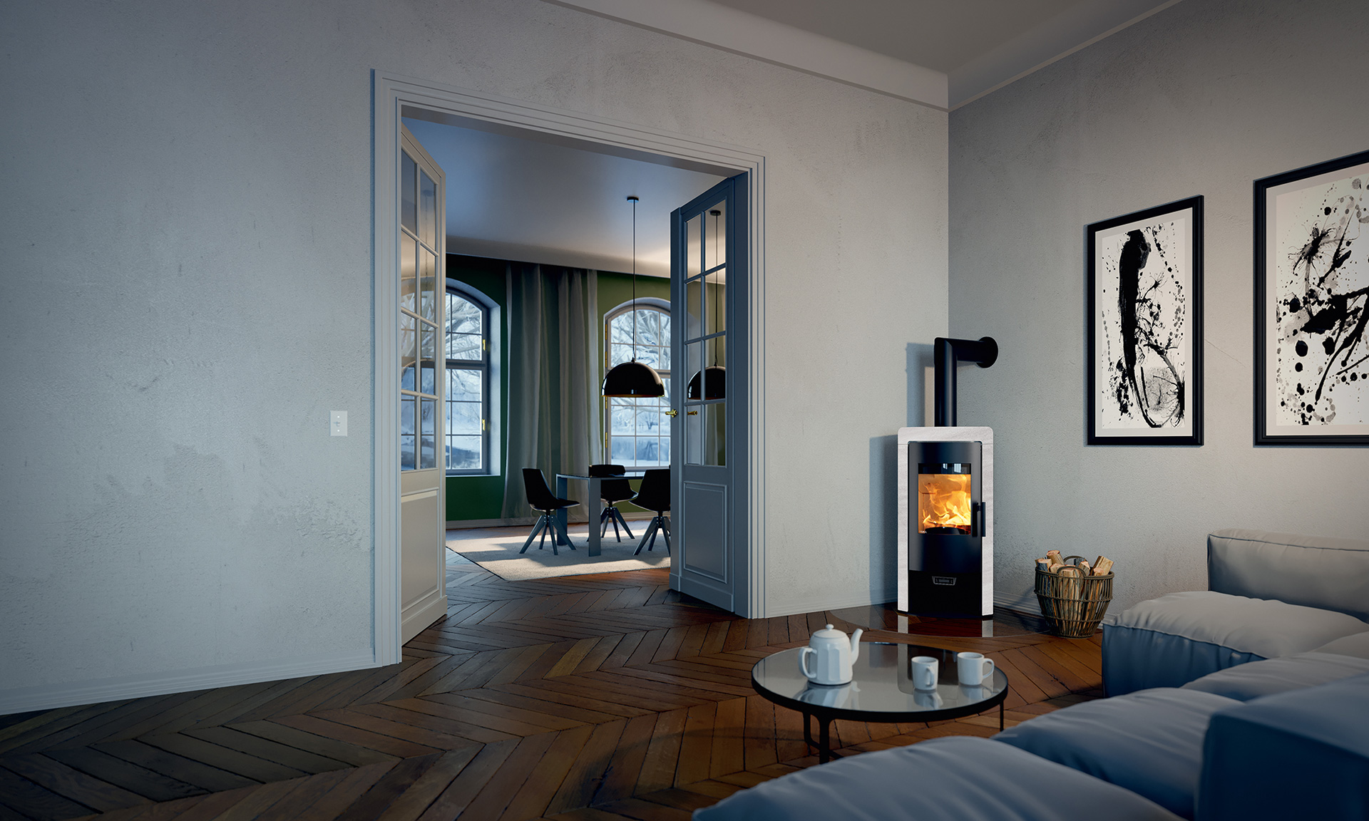Sein exklusives und zeitloses Design zeichnen ihn aus. Eleganter Ofen mit besonderer Korpusform.