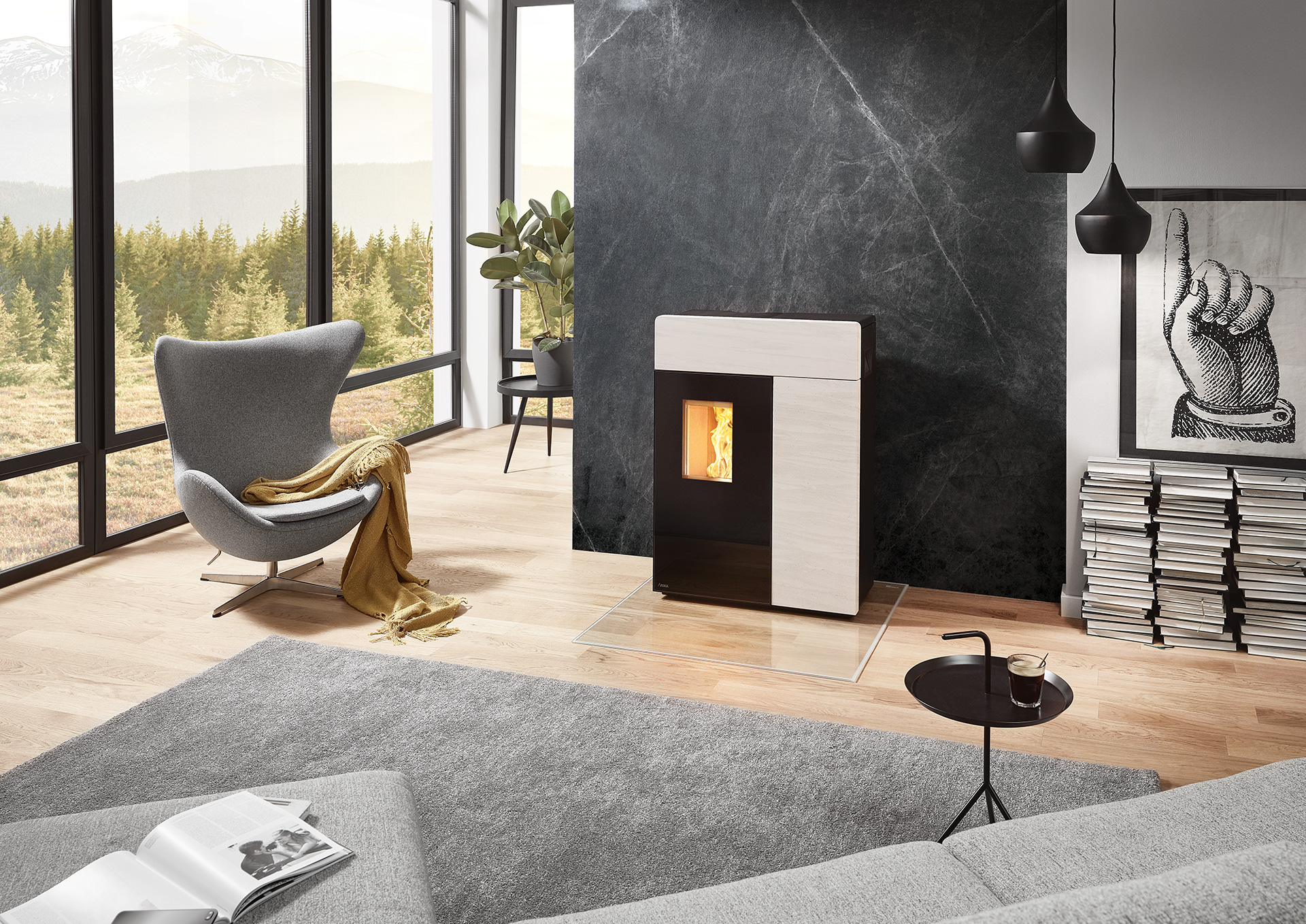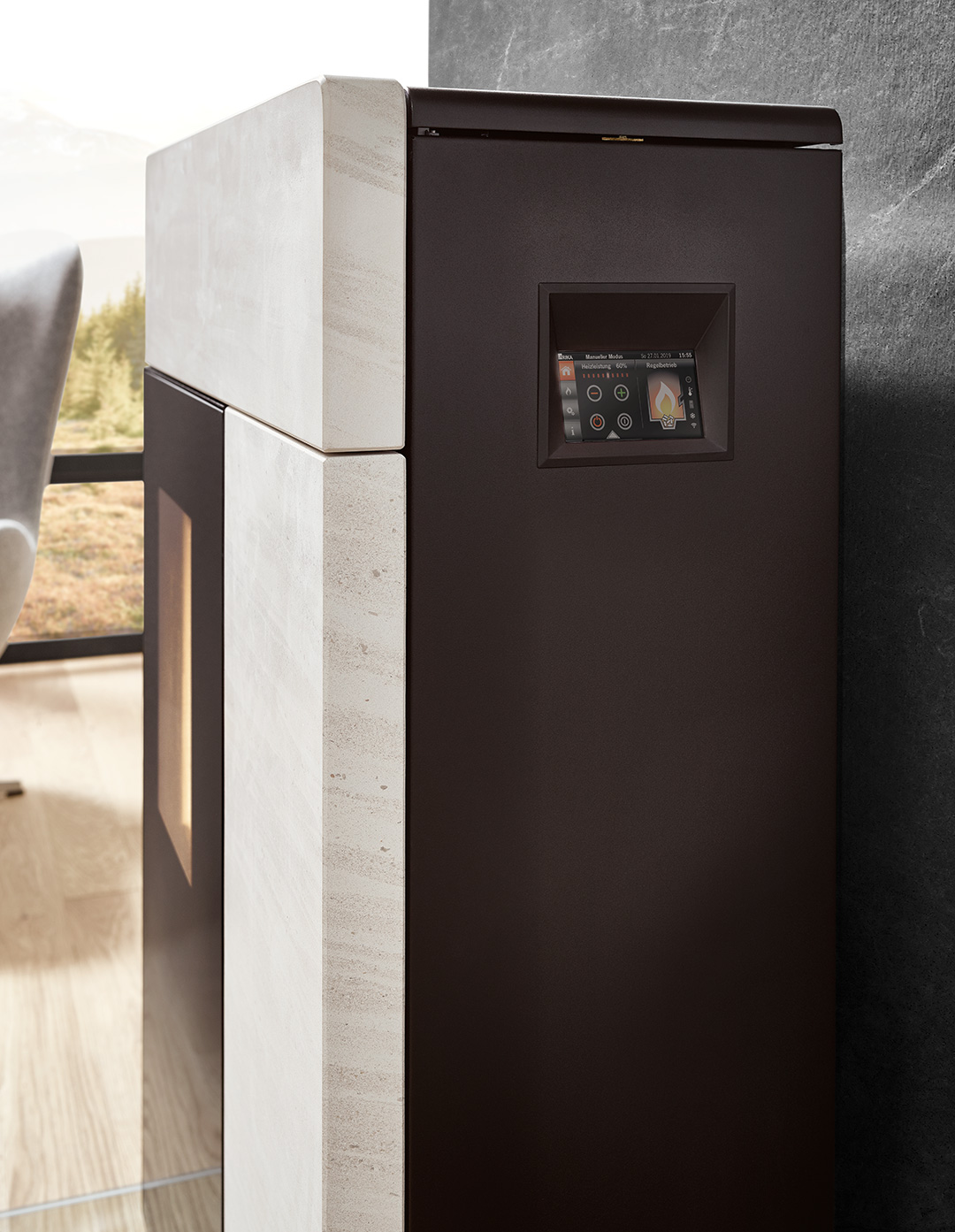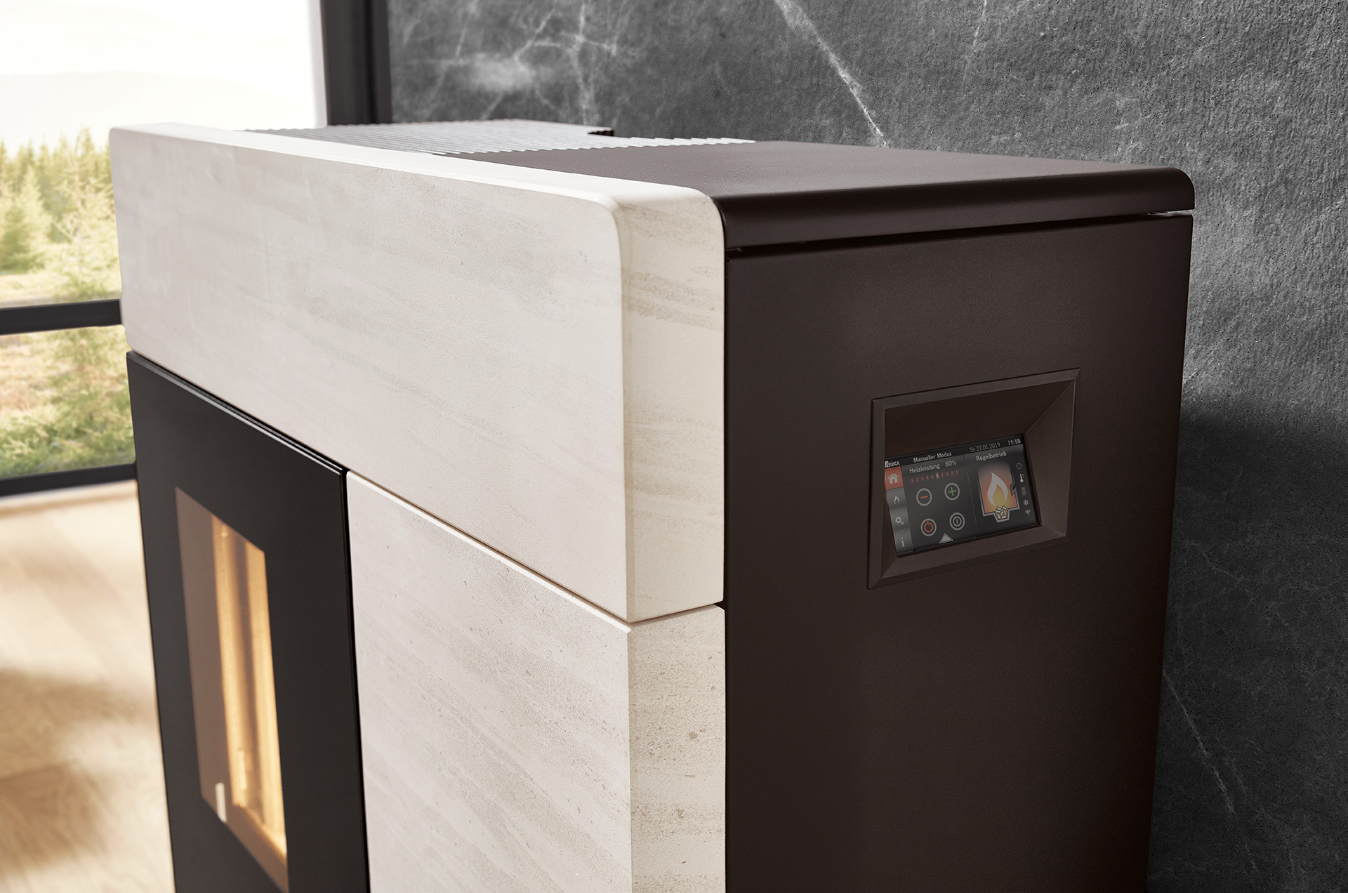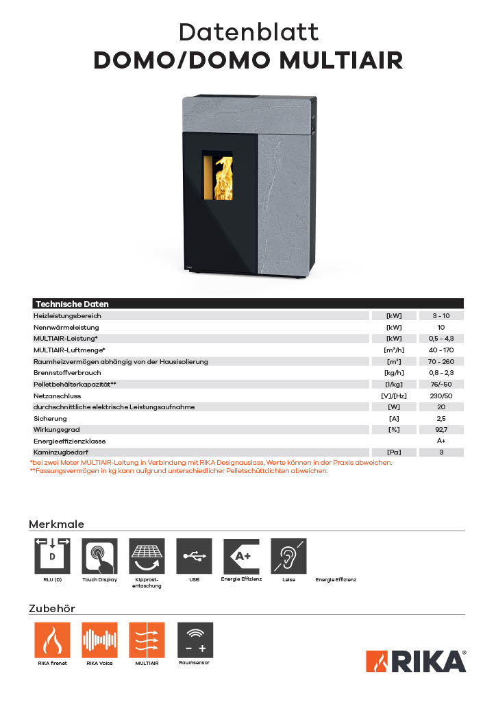 RIKA DOMO weiß Ästhetik und moderne Technik geschickt in einem innovativen Pelletofen zu vereinen. Die breite, mit Stein Weiß oder Speckstein verkleidete Front sorgt für ein natürliches Ambiente, während Sie das lodernde Flammenbild genießen. Im Inneren weiß der Pelletofen DOMO mit innovativer Technik zu überzeugen: Touch Display mit elektronischem Türöffner und automatische Entaschung sind nur zwei RIKA Features in einer Reihe technischer Finessen. Die zahlreichen Anschlussmöglichkeiten erleichtern die Integration des Ofens in Ihren Wohnraum.