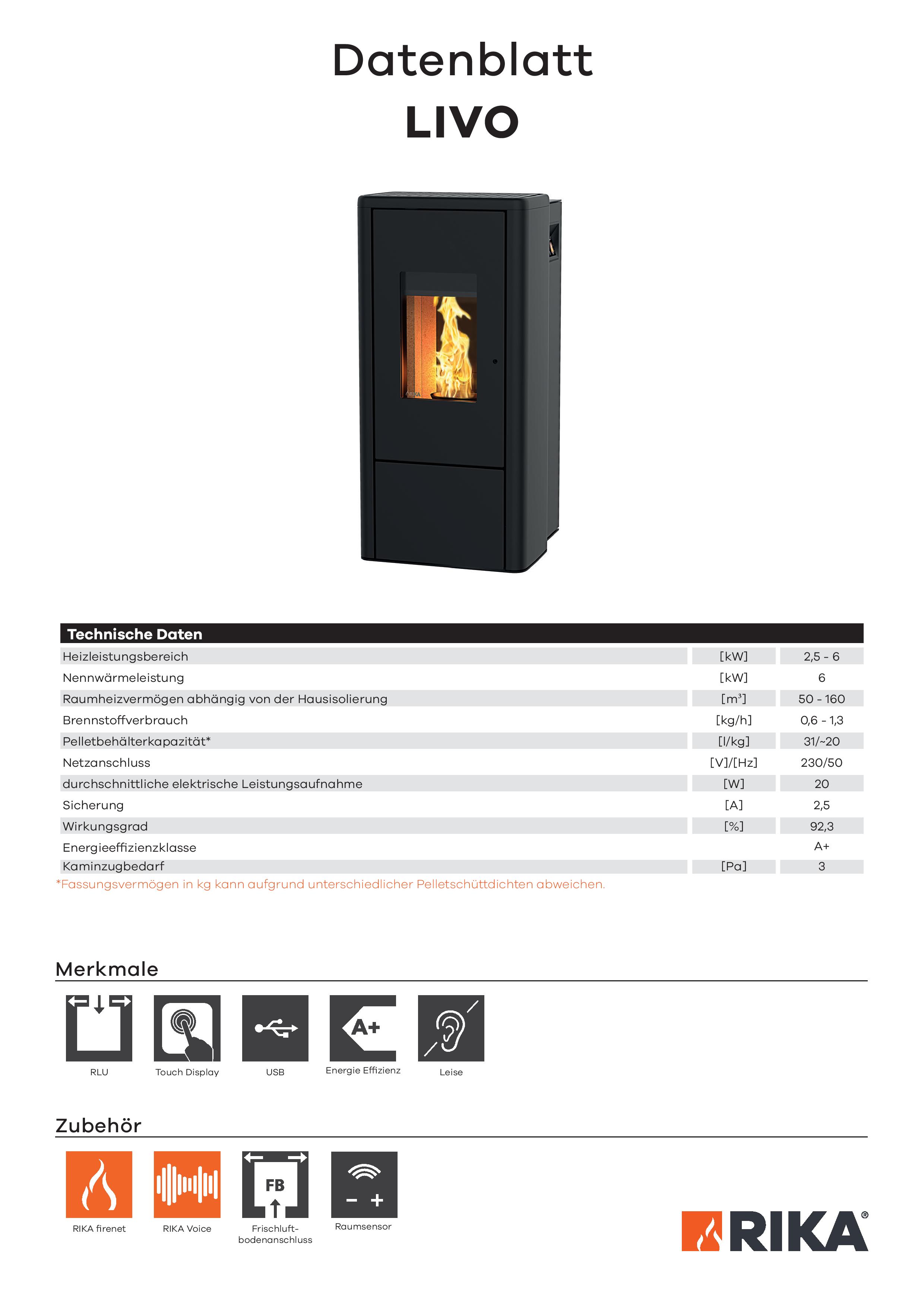 Der Pelletofen LIVO besticht mit einer Besonderheit: der 20 kg fassende Pelletbehälter ist optisch vom Korpus abgegrenzt, wodurch sich der Ofen dezenter in das Ambiente Ihres Wohnraums einfügen kann. Neben dieser optischen Finesse weiß der raumluftunabhängige Pelletofen mit einem Leistungsbereich von 2.5 bis 6.0 kW auch technisch zu überzeugen. Für eine einfache Bedienbarkeit ist durch ein Touch-Display gesorgt. Optional kann zudem ein Rauchrohranschlussrohr auf der Ofenoberseite montiert werden.